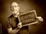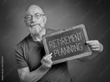 Retirement planning sign. Senior man, advisor, teacher or mentor is sharing text in white chalk handwritten on a blackboard.