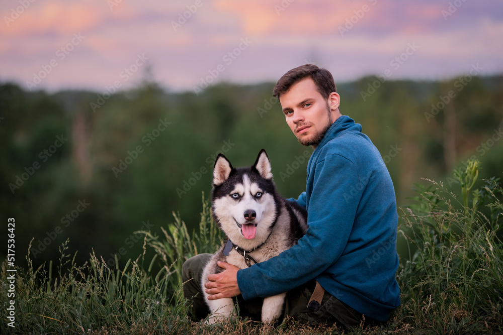 Portrait of a handsome young man and his pet dog Siberian Husky in nature.