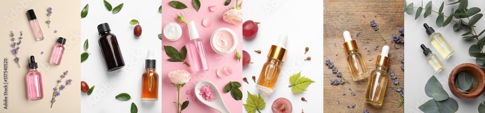 Collage with beautiful photos of different natural essential oils, top view. Banner design