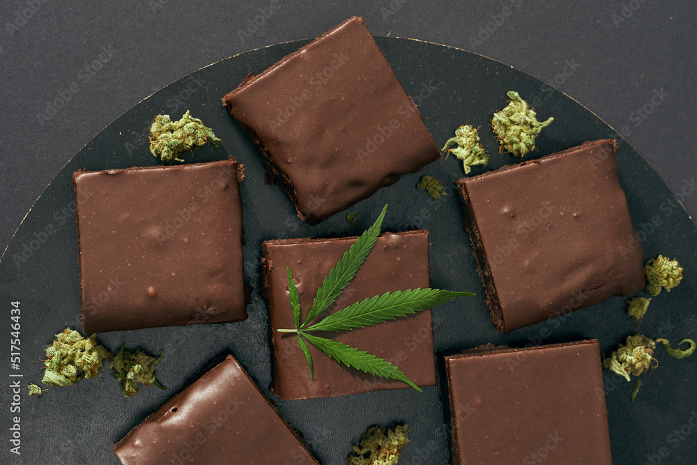 Plate with cake pieces and green marijuana