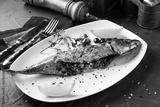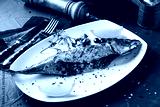 Baked mackerel stuffed with herbs, served with parsley on a white plate. Concept of a healthy homemade food.