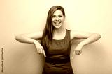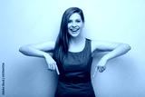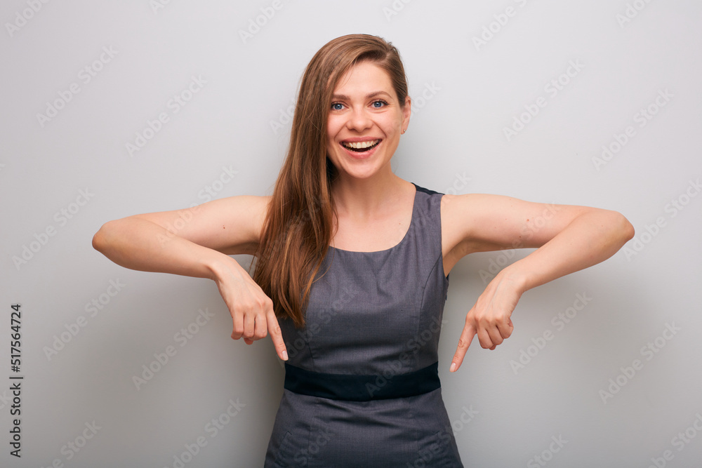 Smiling business woman office worker in gray dress pointing finger down. isolated female business person portrait.