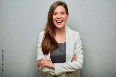 Smiling business woman in white suit isolated portrait.