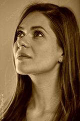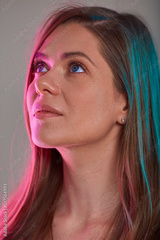 Young woman looking up, female face beauty portrait with multicolored light. natural skin and long hair.