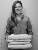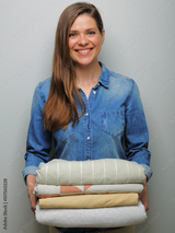 isolated portrait laundry hotel service concept. Smiling maid woman with clothes stack or bed sheets, towels.
