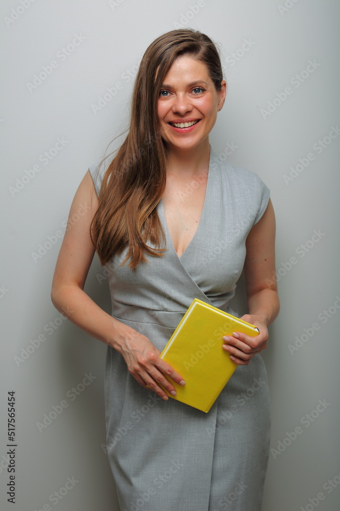 Teacher woman or student, business woman with yellow book isolated female portrait.