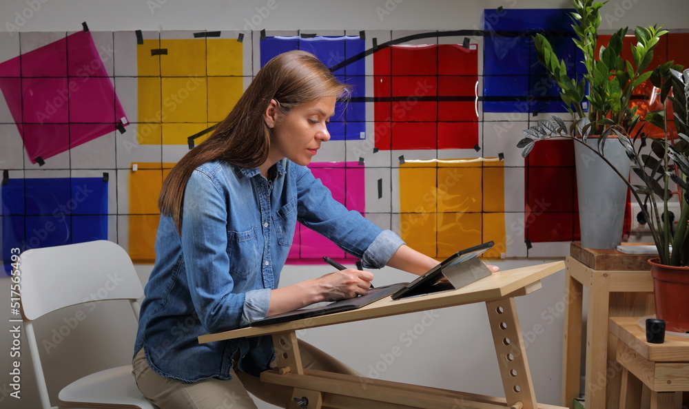 Serious woman designer working at home, wall with red, blue, yellow color palette