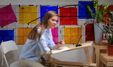 Woman designer learning online with color palette on wall.