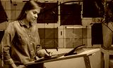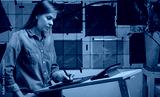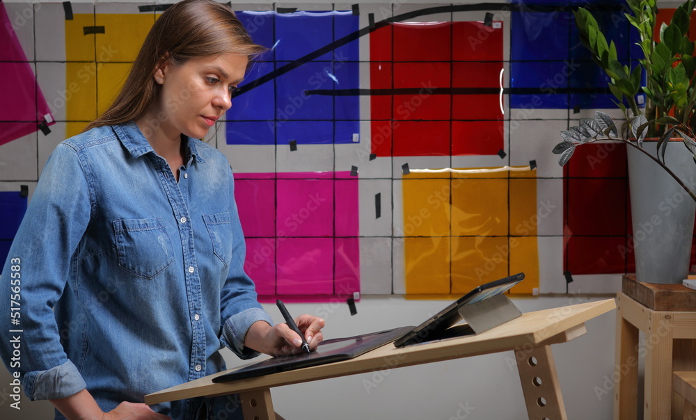 Woman designer working with tablet and looking on display. Wall background with color palette
