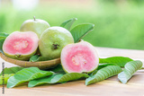 Sweet Red Guava fruit with leaf on blur garden background, Fresh Pink Guava fruit on wooden basket over natural farm background.