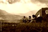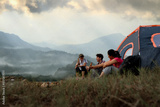 Asian young people groups sit enjoy with beer and drinking near a camping tent with mountain views of natural rainforest in foggy weather. Enjoying nature with soft light rain in background