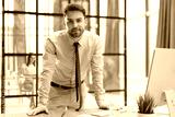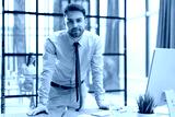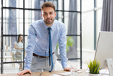 Young modern business man analyzing data using computer while working in the office with collegues on the background.
