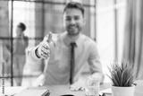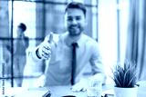 Businessman with an open hand ready to seal a deal in office with collegues on the background.