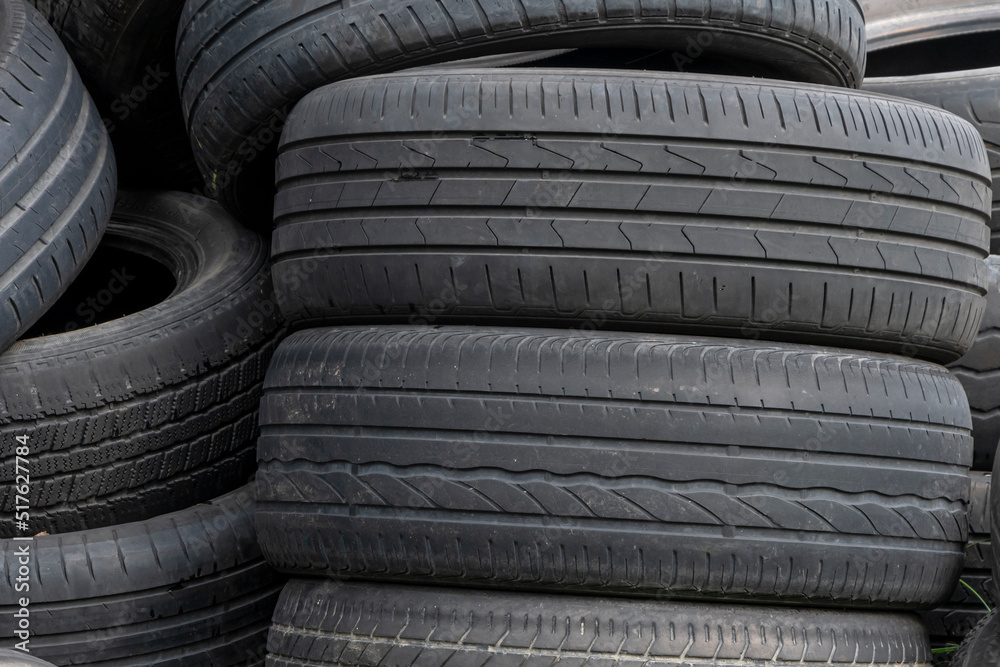 Old car tires, worn tread, worn rubber, a pile of old car wheels, a dump of worn tires from used cars. Environmental pollution.