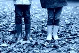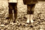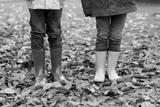 Two little children playing in red and yellow rubber boots in autumn park in colorful rain coats and clothes. Closeup of kids legs in shoes dancing and walking through fall autumnal leaves and foliage
