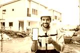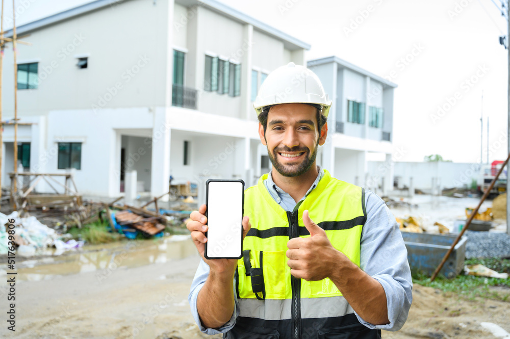 Young construction man smiling bearded in vest with white helmet demonstrating blank smartphone and showing thumb up to the camera while standing on building construction site. White screen, mockup.