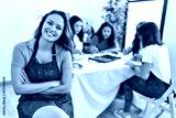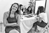 Group of women drawing sitting on the table. Hispanic woman smiling happy with arms crossed gesture at art studio.
