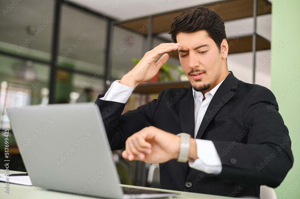 Upset latin male office employee looking at the watch and checking time, missed important meeting, has deadline with project, forgot about appointment