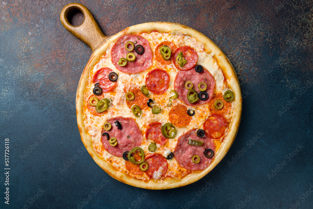 Mexican pizza with meat, sliced sausages and jalapeno with cheese top view on blue concrete table