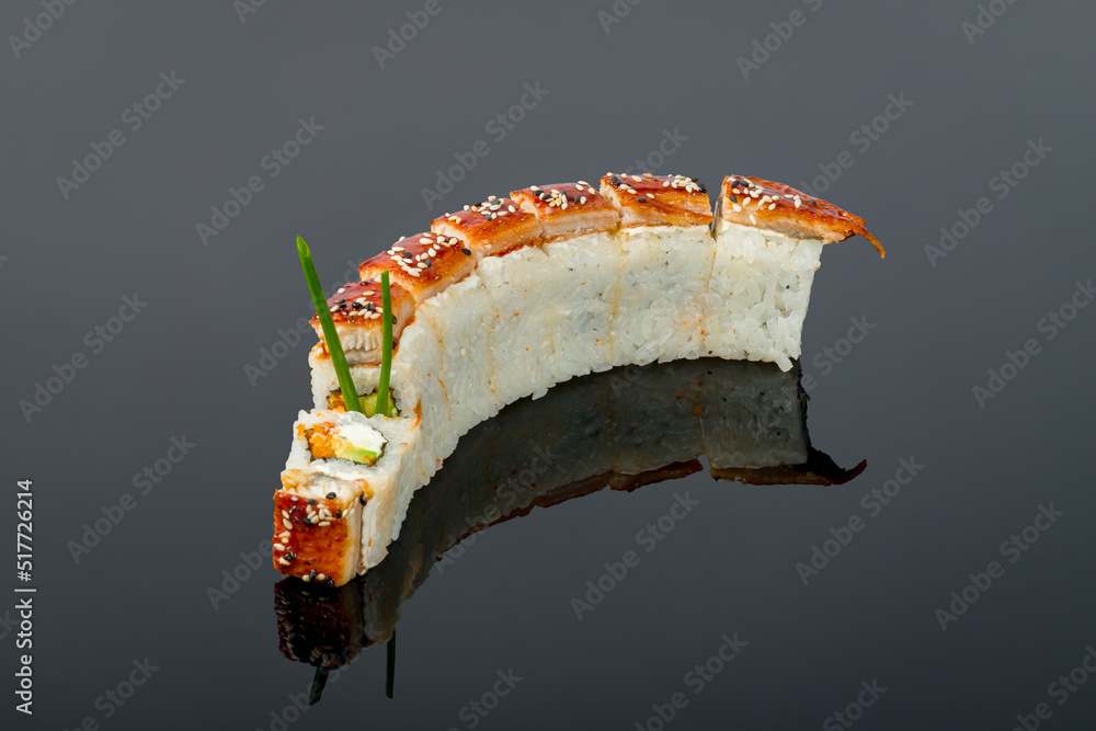 The dragon roll with eel and cheese on black with reflection