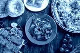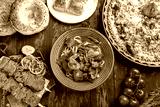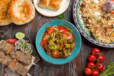 dishes of Uzbek cuisine lagman, pilaf, skewers of lamb, bread and vegetables on old wooden table top view