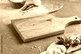 Food mockup. Empty wooden board on concrete table with pastry ingredients. Wooden board with flour, eggs and textile for bakery menu. Bakery mockup. Pastry composition with empty place.