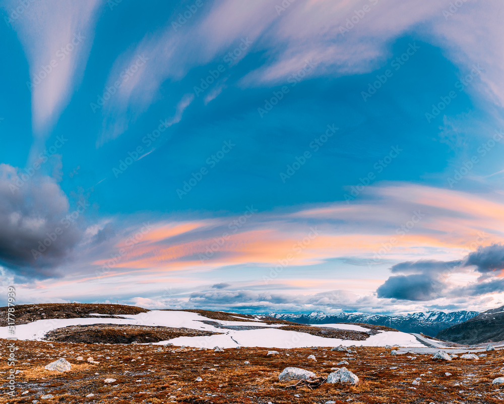 Aurlandsfjellet, Norway. Sunset Sky Above Road Aurlandsfjellet. Scenic Route Road In Summer Norwegian Landscape. Natural Norwegian Landmark And Popular Destination.