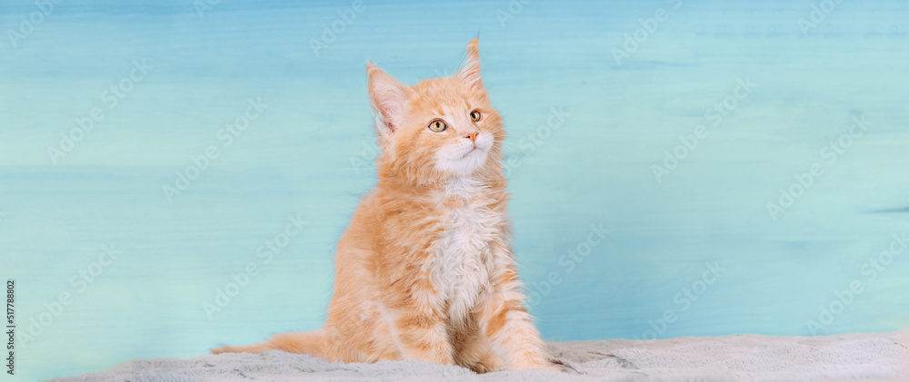 Cat Copy Space Background In Light Blue Color Colour. Young Red Maine Coon Kitten Cat Sitting On Sofa. Coon Cat, Maine Cat, Maine Shag. Amazing Pets Pet. Portrait On Backdrop. Panorama Panoramic View.