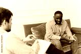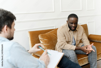 An African-American man talks to a psychologist about his problems. Psychological help service.
