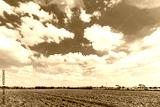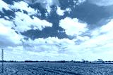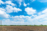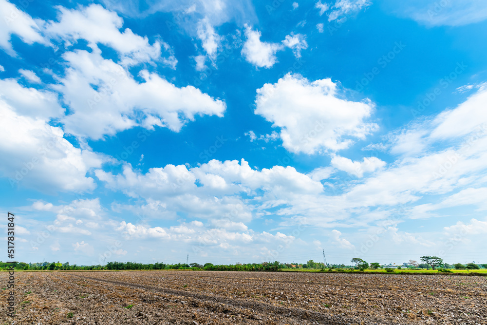 landscape scenery a meadow soil in a rice field Preparation of paddy field for sowing the rice seed with fluffy clouds blue sky daylight background.
