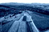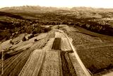 Farm landscape on rolling hills in Tatras mountains at summer sunrise