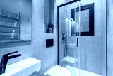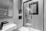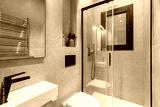 Simple bathroom with black faucet, white toilet, wooden furniture and beige tiles. Modern interior of refurbushed apartment.
