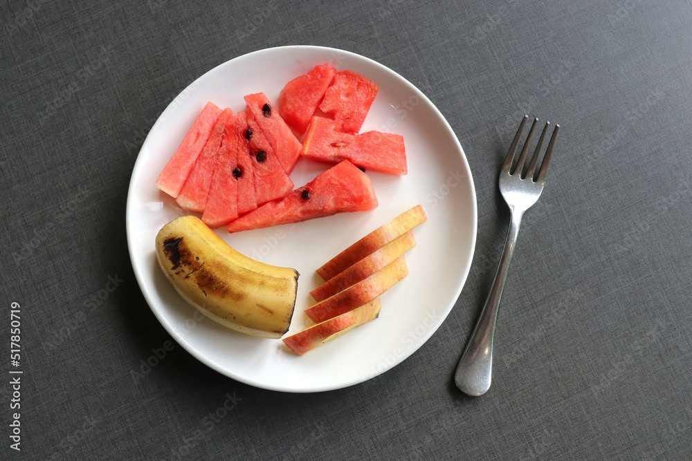 Healthy fresh fruit salad in a white plate on black background. cut fruit plate of Apple, banana, and watermelon Top view. copy space.