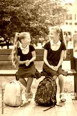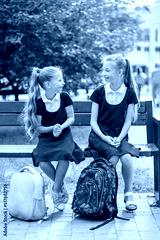 Two children of schoolgirls sit on bench near school, have fun and communicate. Back to school