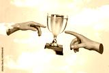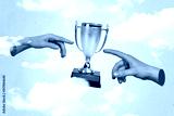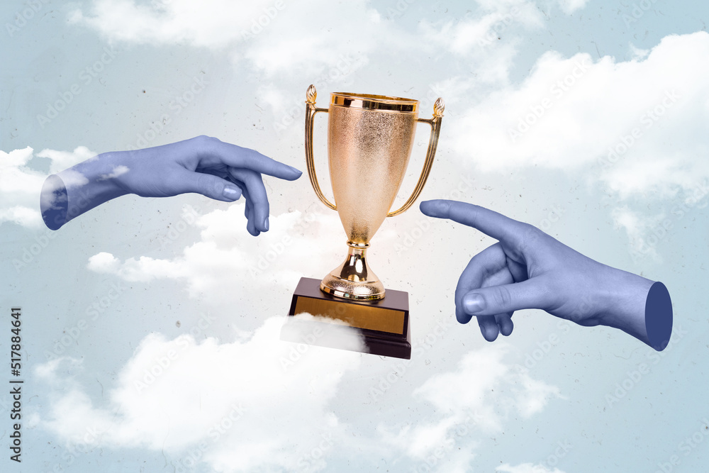 Composite collage picture of two blue human arms fingers reach touch award cup isolated on creative clouds sky background