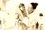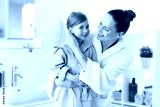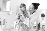 beauty, hygiene and people concept - happy smiling mother and daughter with moisturizer on their faces in bathroom