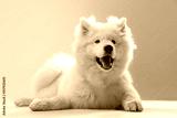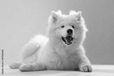Studio shot of beautiful fluffy white Samoyed dog posing isolated on orange color background in neon light. Concept of animal, pets, care, fashion, ad