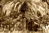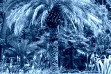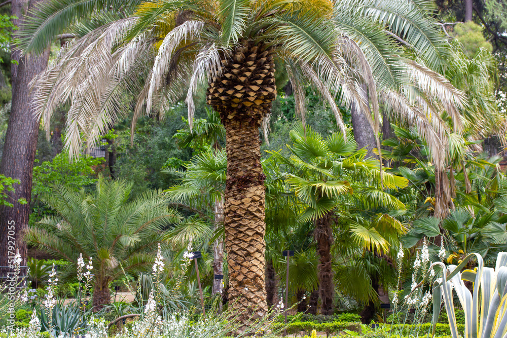 Palm tree grows in botanical garden, tropical park, jungle. Many palms and other trees with lush foliage. A natural landscape without people. Green design. Blossoming botanical Garden in Madrid, Spain
