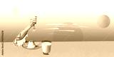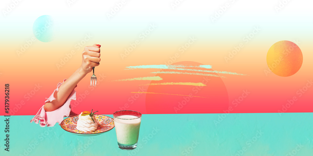 Contemporary art collage. Colorful design with delicious dessert and glass of milk for breakfast. Eating with beach landscape