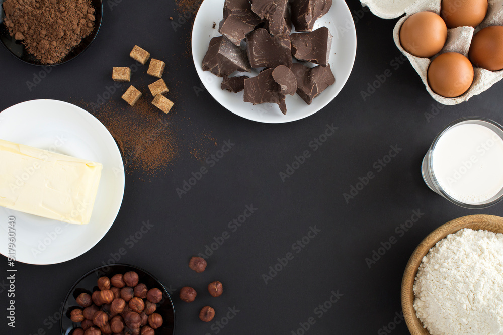 Top view of ingredients for making chocolate cupcakes, muffins or cake on the black background. Copy space.