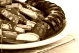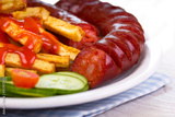 Sausage and french fries on the plate