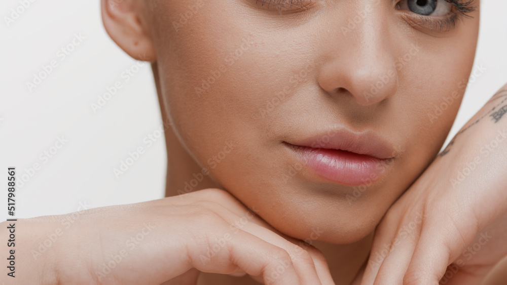 Attractive young slim Caucasian woman strokes her jawline looking at the camera on white background | Face moisturizing concept