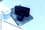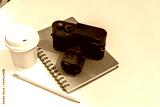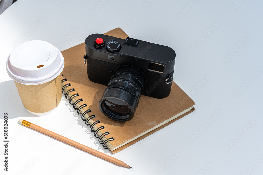 Hot coffee latte with latte in cup made of paper and camera in notebook on white wood table desk on top view. As breakfast In a coffee shop at the cafe,during business work concept