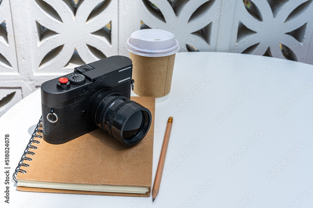 Hot coffee latte with latte in cup made of paper and camera in notebook on white wood table desk on top view. As breakfast In a coffee shop at the cafe,during business work concept