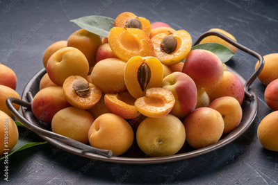 Fresh Apricot fruit with leaf on wooden background, Yellow Apricot on black plate over wooden Background.
