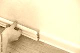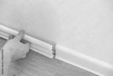 A man installs a floor skirting board. Fixing the plastic skirting board with screws to the wall. Home renovation.