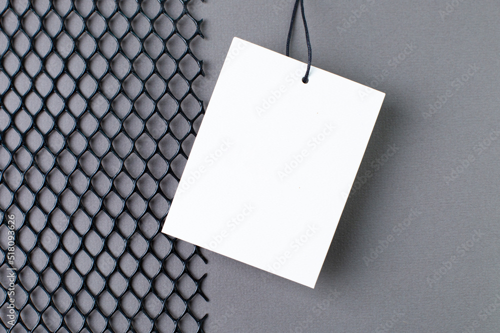 Blank tag tied with string. Price tag, gift tag, sale tag, address label on gray background modern Technology design