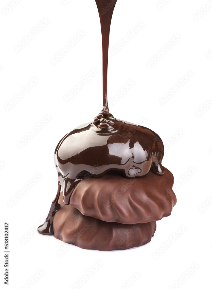 marshmallows in chocolate poured over chocolate on a white background