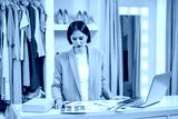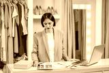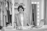 Young female fashion designer choosing fabrics for tailoring and ordering online on laptop in studio. Small business