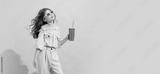 Fashionable little girl, kid posing isolated over pink color background. Concept of children emotions, fashion, happy childhood, beauty, school and ad